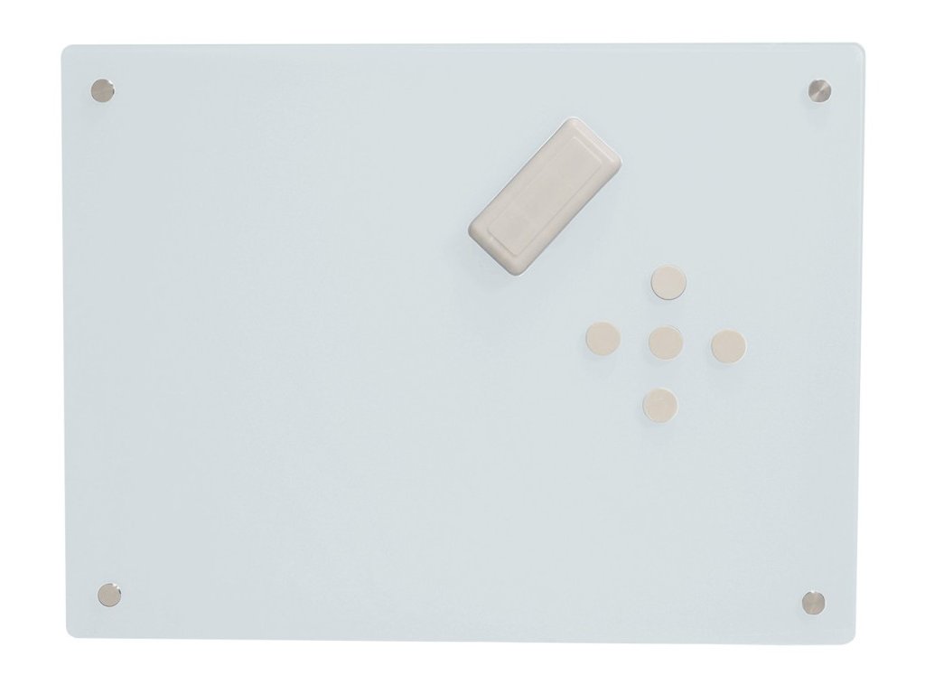 Obsah balení: skleněná tabule Glass2write, skleněná odkládací police, magnetická stěrka, 5 kulatých magnetů, montážní materiál