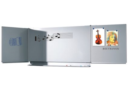 Školní tabule Triptych s matným projekčním povrchem ve středové části, křídla oboustranně bílá nebo zelená. Rozměry 200 (400)x100 cm.